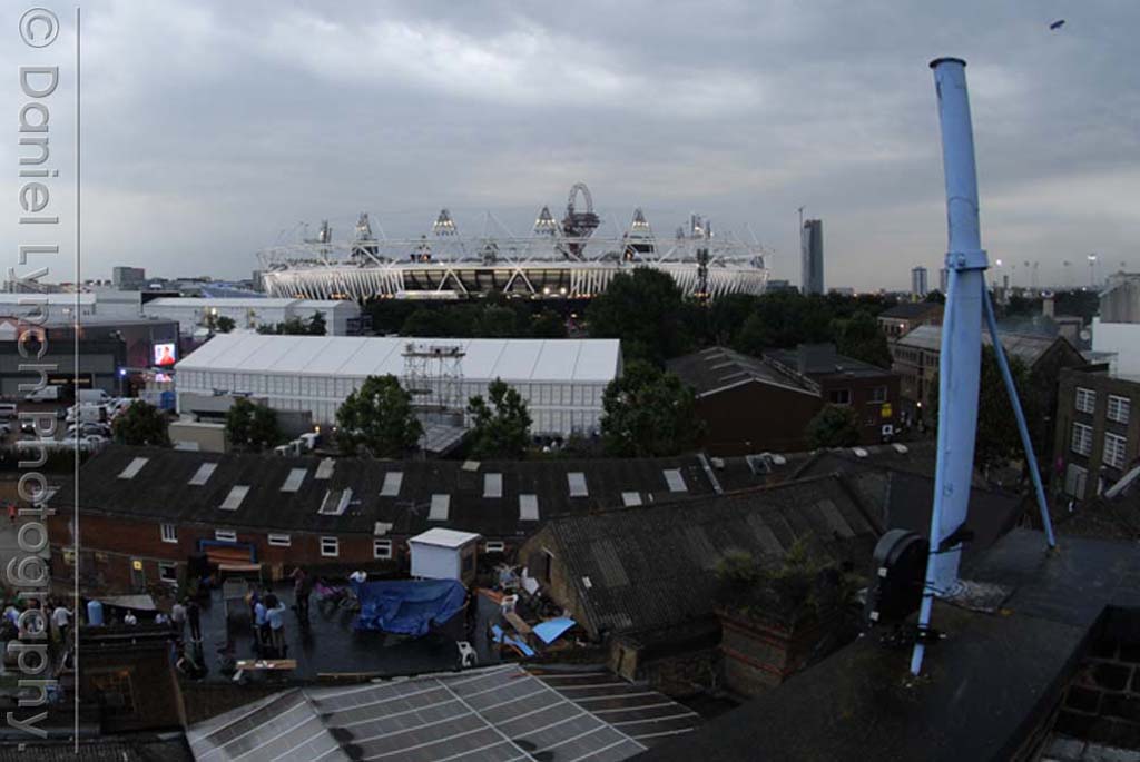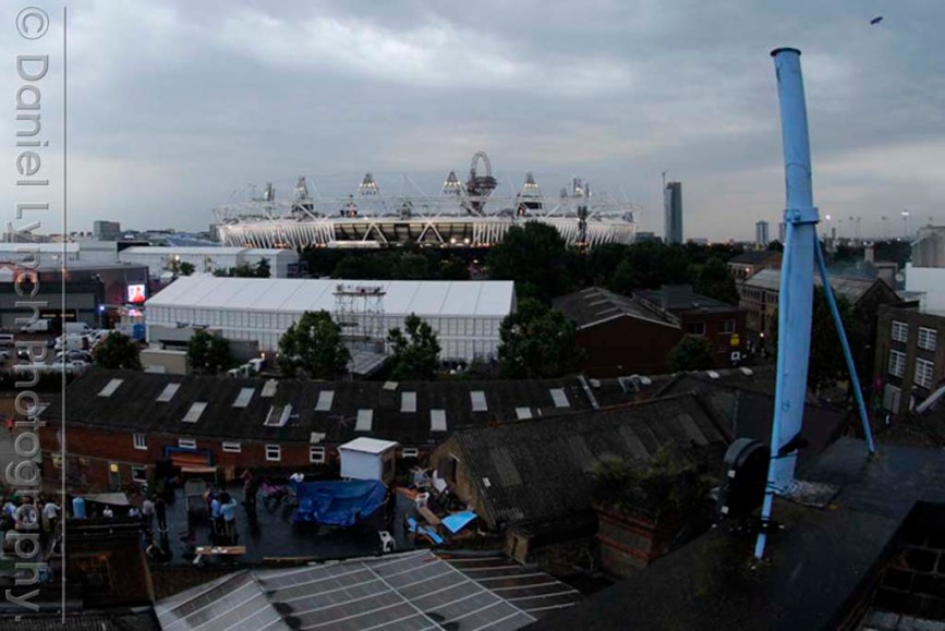 I had arranged many months previously to shoot the opening ceremony from the balcony of a Stratford tower block called Lund Point, as mentioned in a previous post ‘No Room In The East’ but here I found myself a fortnight from the main event without being able to contact my host. Leaving a number of voicemails & even making a frantic visit to the block provided fruitless. I was panicking… I made a couple of late night trips around the venue scouting out a vantage point to shoot from, when I remembered my old friends at the Algha Works.