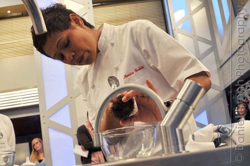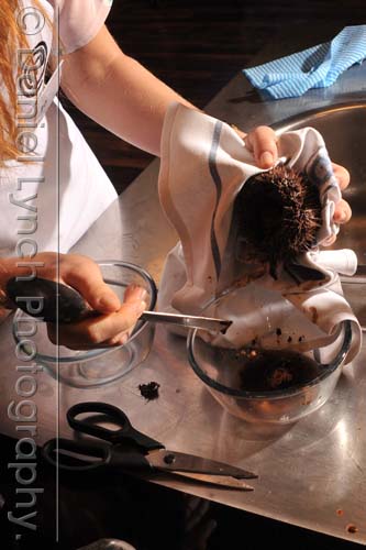 The first task for Jo was to extract the delicate meat from the sea urchin’s husk & prepare it. It sounds quite simple, but it was far from it with the sea urchin being particularly difficult to handle. At the second attempt, Jo felt she’d extracted enough meat for her dish.