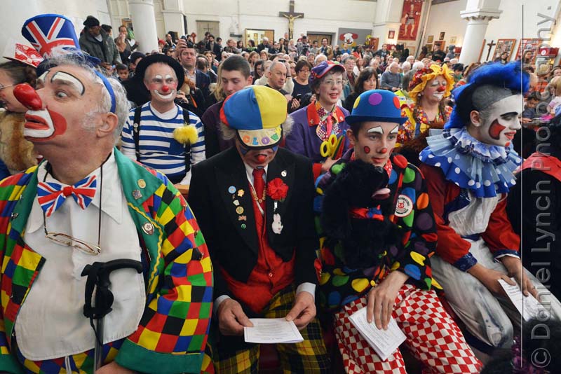 Once all the clowns have filtered through the crowd, they occupy the front few pews for the main service.