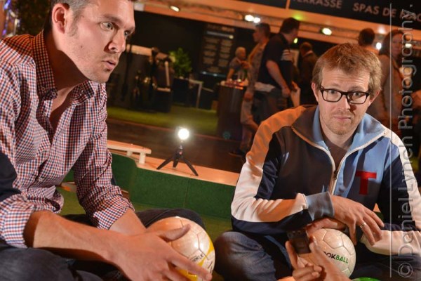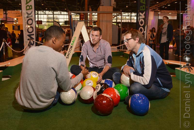 This is Aurélien Deshayes (glasses & tracksuit) and Samuel Dreher (red shirt, dark hair), Founders & Creators of “Snookball”, a new sport-game that combines Snooker & Football photographed at the Foire De Paris Expo, Paris, France.