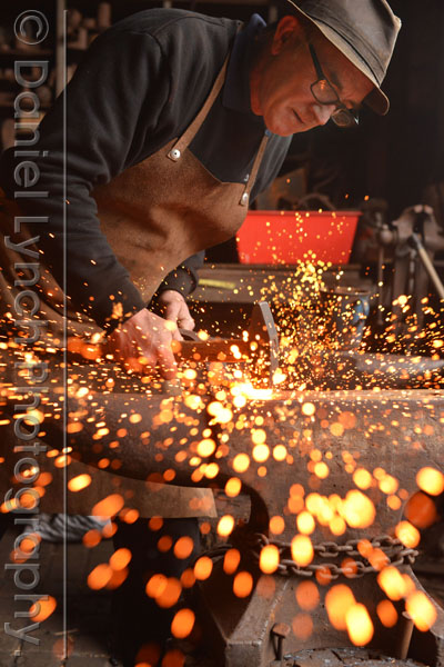 This shot was part of a set that was voted best Features (set of four) at May’s Press Photographer’s Awards- an award I was very honoured to recieve as it’s voted for by fellow press photographers. There’s no way that the little Lumie has the chocks to overpower molten metal straight from the forge, but the light hitting our blacksmith’s face makes this shot.