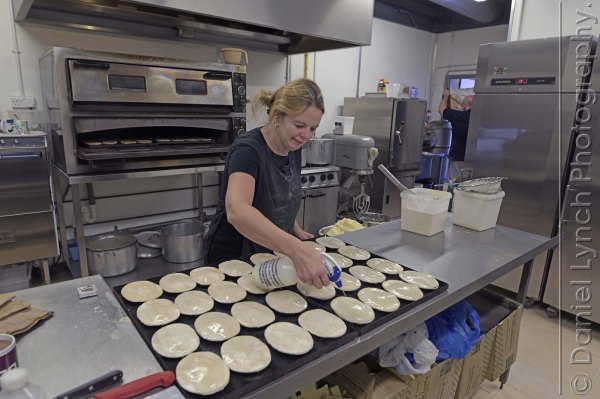 Picture shows the busy kitchen area where 32 cooked pies come out of the ovens every 8 minutes.