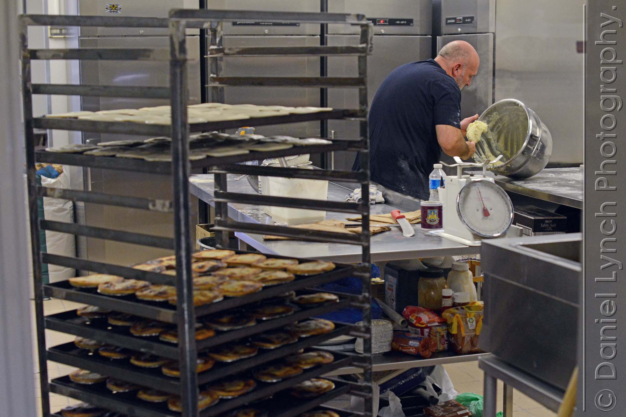 Picture shows the busy kitchen area where 32 cooked pies come out of the ovens every 8 minutes.