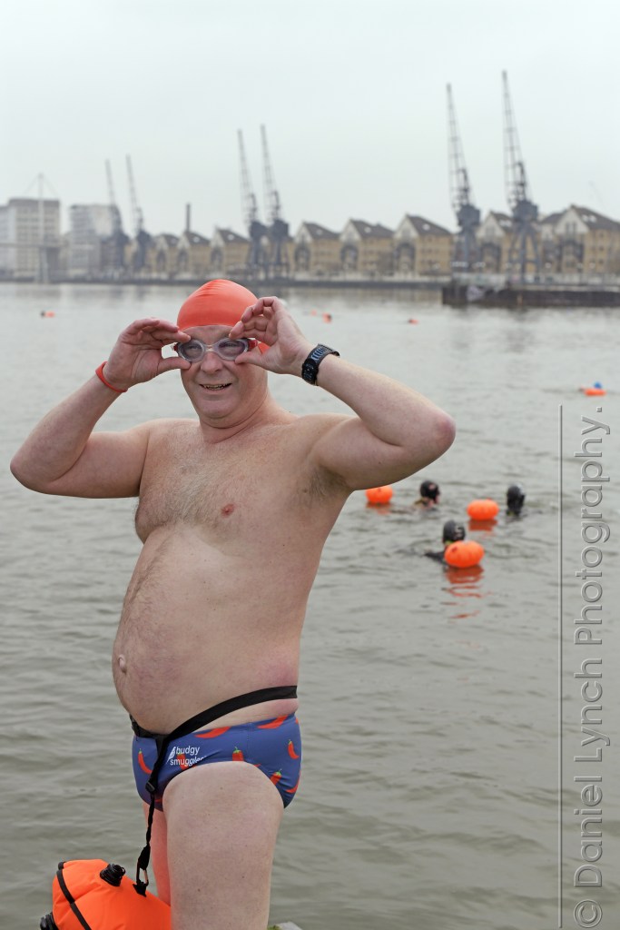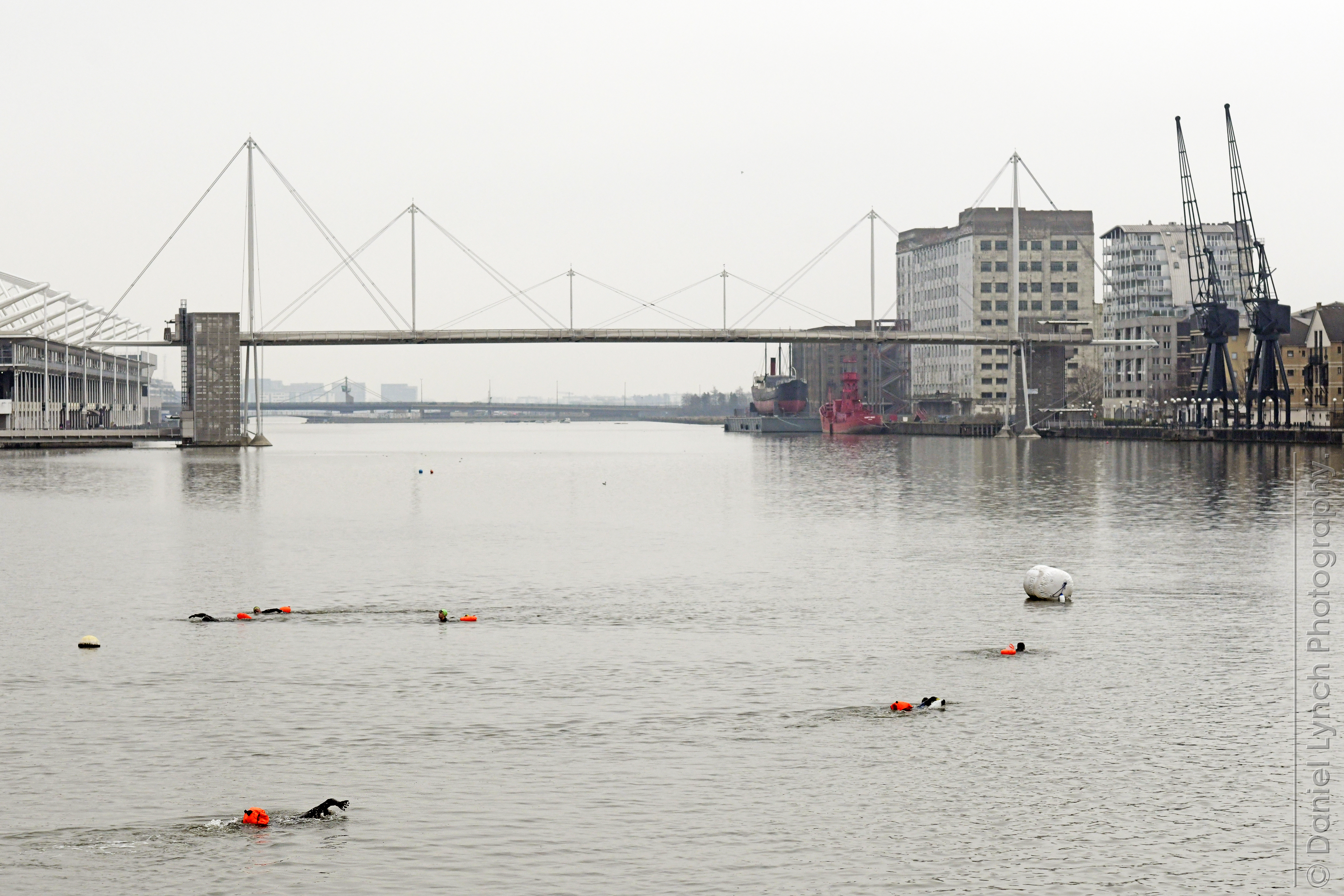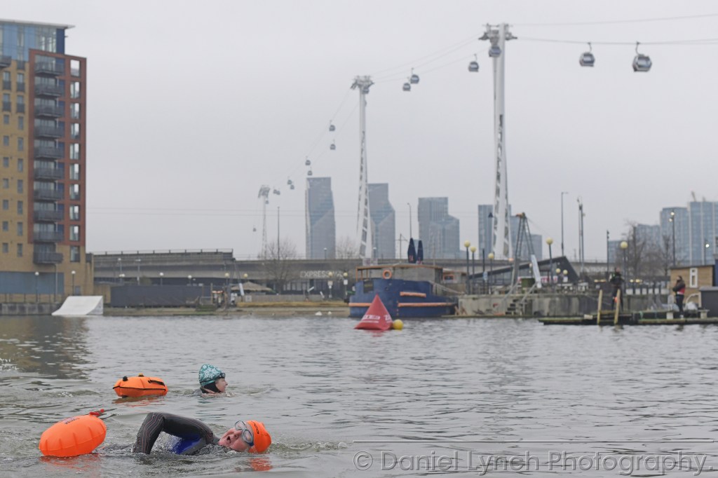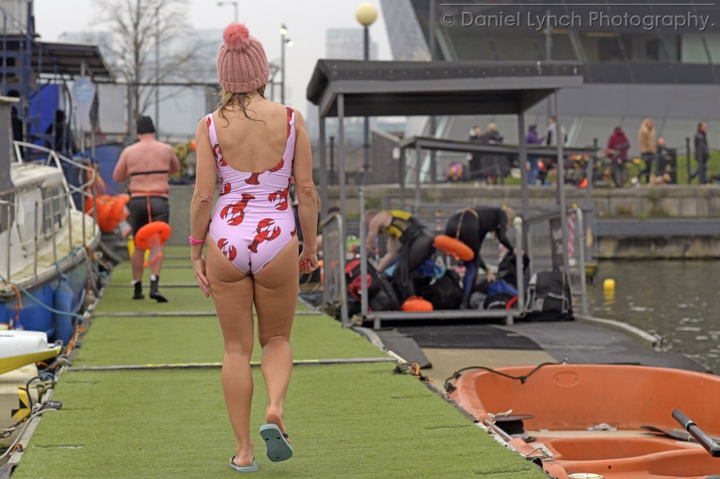 Under the flightpath of London City Airport & directly beneath the Emirates Air Line, groups of 30 at a time filed along the pontoon & into the ice-cold water: