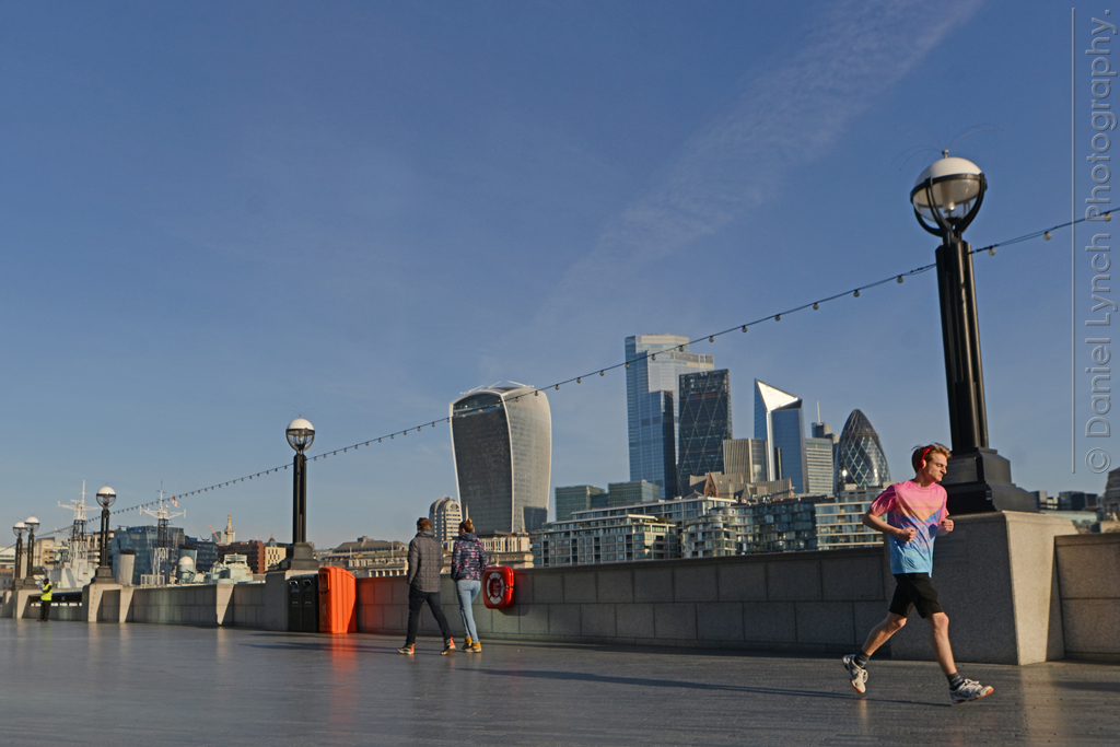 We were also allowed one form of exercise per-day for up-to an hour. And that’s where my own personal Covid story began. On the morning of Monday 23rd March 2020, I hauled myself up & out at the crack of dawn & headed for the Queen’s Walk on the southern embankment of the river Thames; a spot I knew was both popular with joggers, and one that afforded me a fantastic & iconic ‘London’ backdrop. As the sun rose from beyond Canary Wharf in the east, light streaked through the 100+ year-old landmark of Tower Bridge & I got my shots.