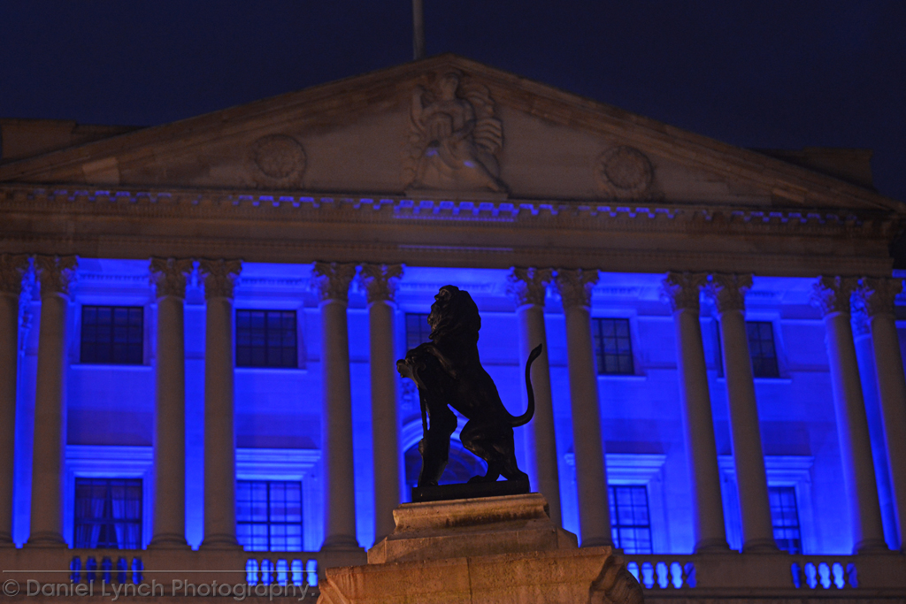 With landmarks illuminated blue
