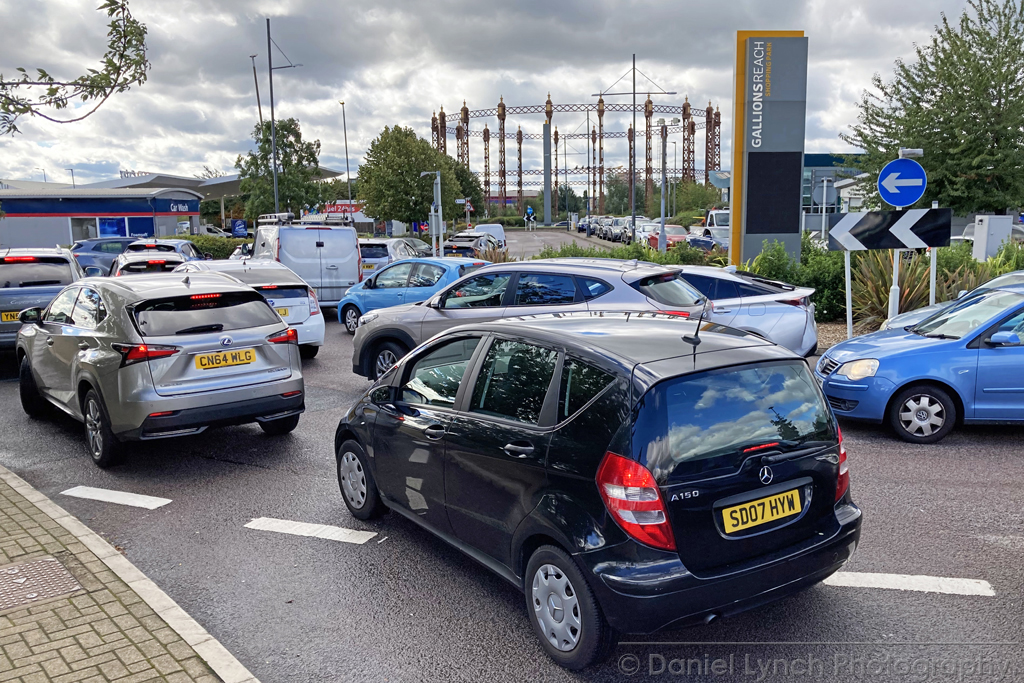 I was on assignment at Gallions Reach retail park in East London beside a deserted Tesco filling station. Ten minutes later a tanker arrived with a snaking trail of cars behind it & the entire area came to a standstill;
