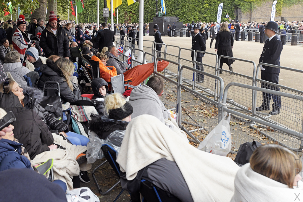 On the sixth day, her funeral service began. I arrived at Westminster station just after 5am with road closures in place at every turn. Heaving crowds were already filling every inch of crash-barrier erected around Parliament Square & Whitehall. I’d secured my spot ahead-of-time in the press pen in front of Horse Guards Parade. To the left of me, the public areas were overflowing with mourners- almost all had secured their spot the night before & camped out in the street. Many were dozing as I began setting up my equipment.