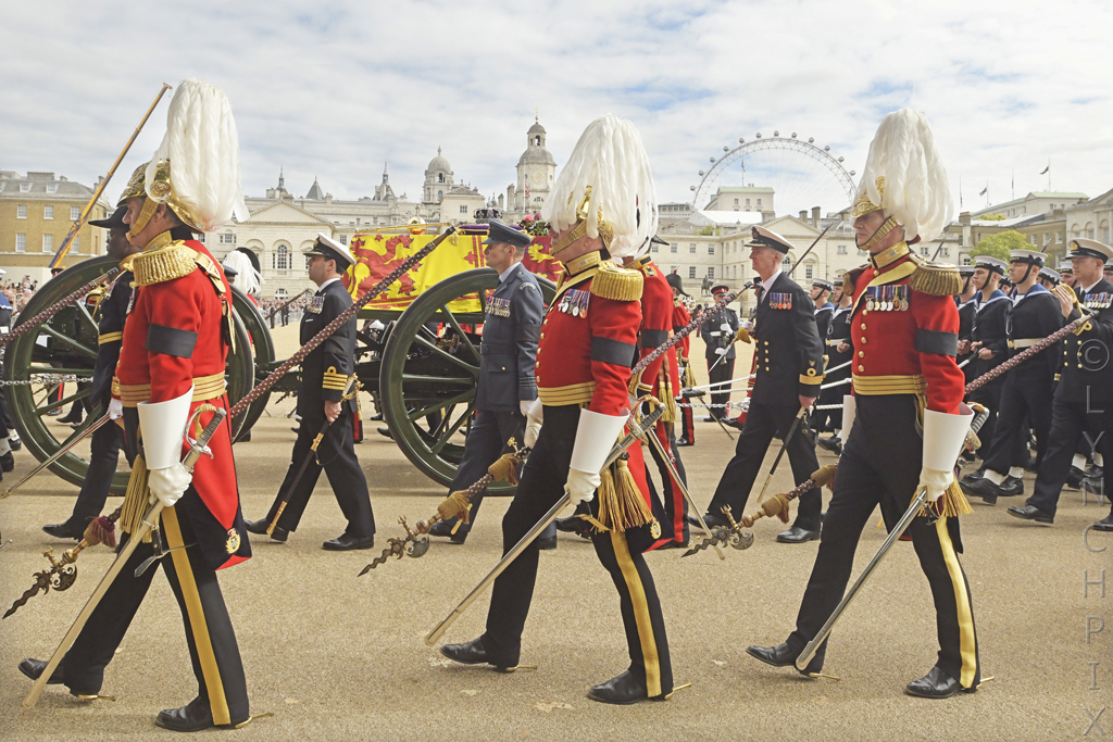 On the sixth day, her funeral service began. I arrived at Westminster station just after 5am with road closures in place at every turn. Heaving crowds were already filling every inch of crash-barrier erected around Parliament Square & Whitehall. I’d secured my spot ahead-of-time in the press pen in front of Horse Guards Parade. To the left of me, the public areas were overflowing with mourners- almost all had secured their spot the night before & camped out in the street. Many were dozing as I began setting up my equipment.
